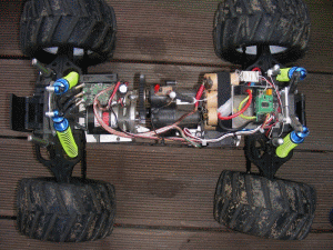 Als Lenkservo ist jetzt ein ThunderTiger DS-1015 drin, das hat endlich genügend Kraft, um die schweren Räder auch im Stand zu bewegen.