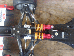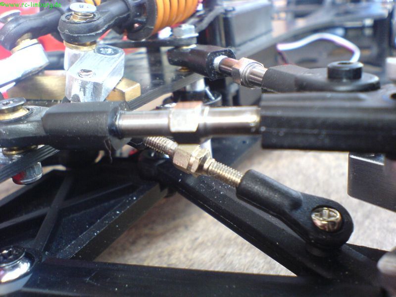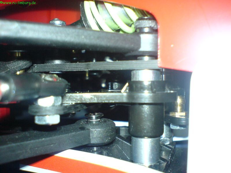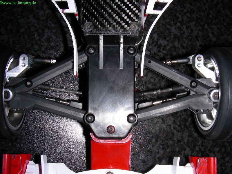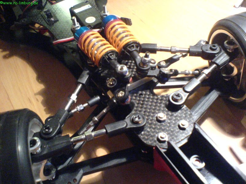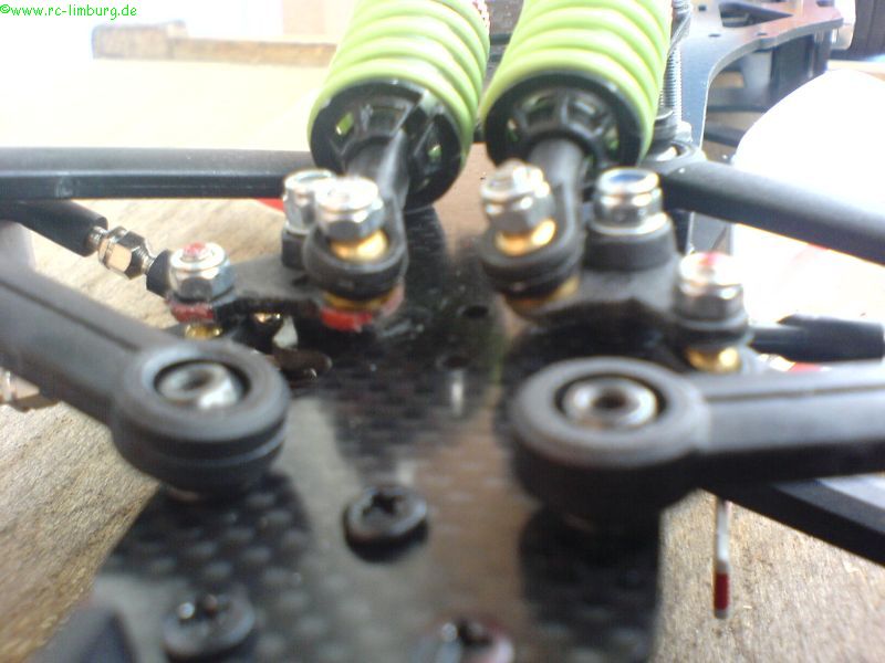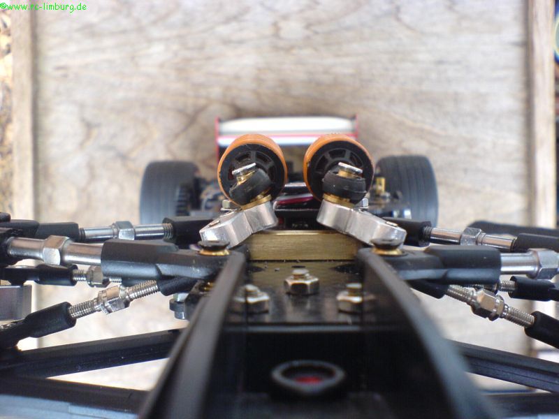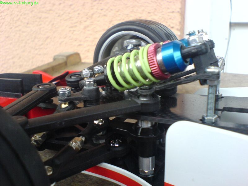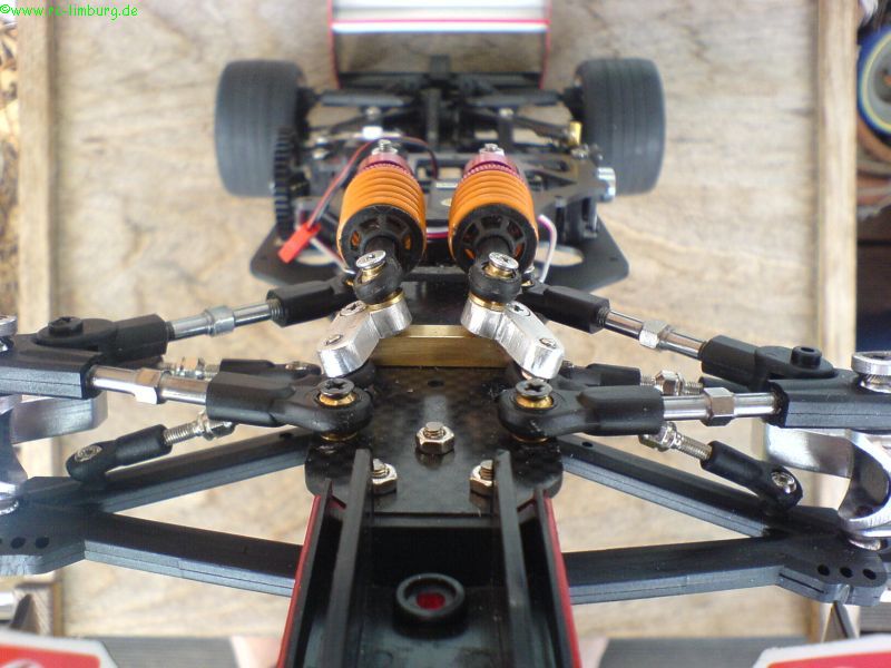 Das Fahrwerk reagiert jetzt wunderbar sanft, die Bodenfreiheit liegt bei 4mm (mit diesem Wert hatte ich auf der Strecke in Hildesheim sehr gute Erfahrungen gemacht), und das Chassis schlägt nicht durch.