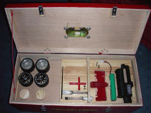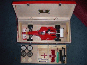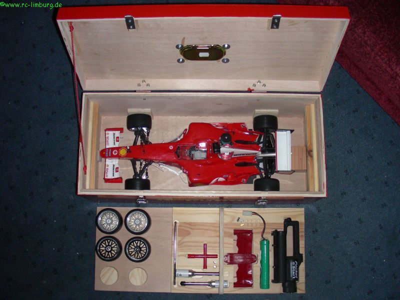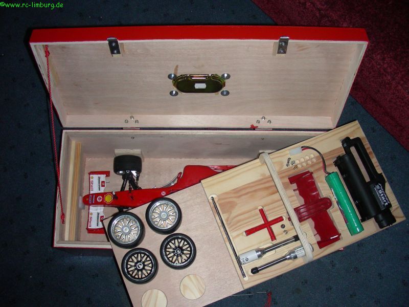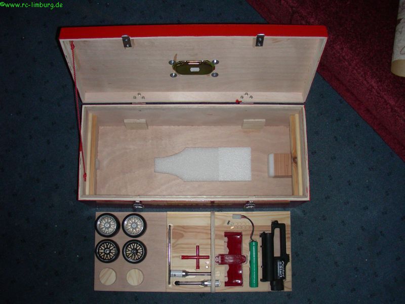 Ausser dem Fahrzeug passen auch noch Ersatzräder, eine komplette Ersatznase, Glühakkus und der Elektrostarter rein.