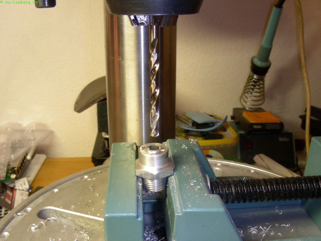 Dann in zwei Stufen auf 5mm aufbohren, anschließend eine Stufenbohrung mit 6mm anbringen, so,