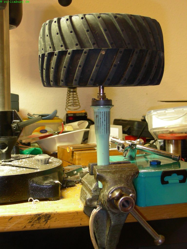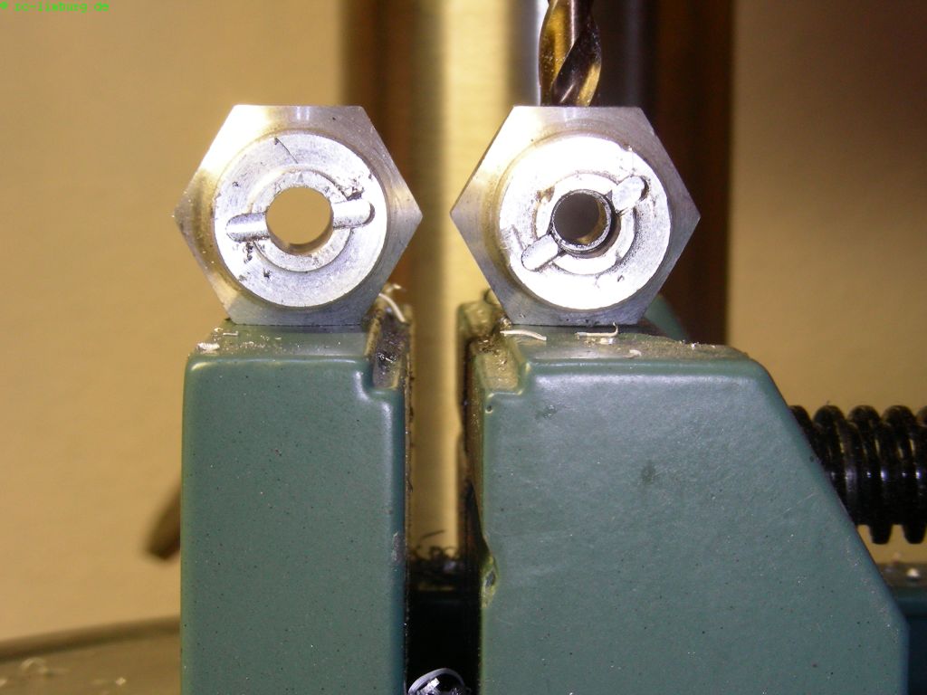 Zunächst müssen die Felgen auf 12mm aufgebohrt werden. Damit es halbwegs zentrisch wird,