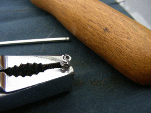 Dann den Kleber anrühren, die Gewindestange dünn (!) damit einstreichen, und zwar so, dass man von dem Ende,