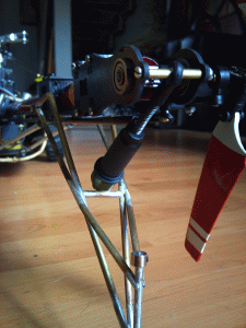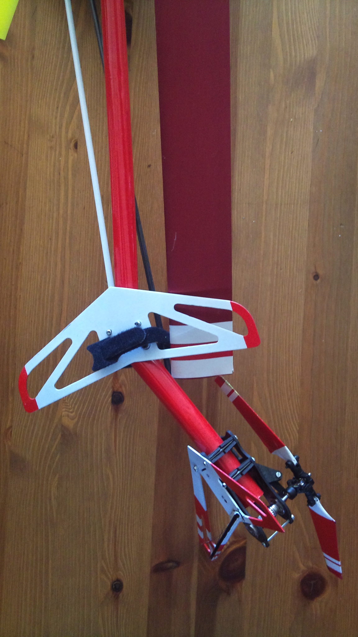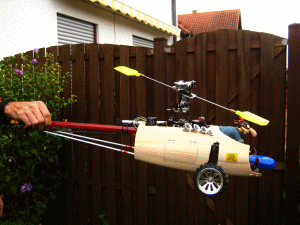 Die Abstützungen für's Heck kann ich mir jetzt komplett sparen. Das Rohr ist so steif, dass ich den Heli am Heck waagerecht (wie im Photo oben) anheben kann, ohne dass sich da etwas bewegt. Und 3D wird damit eh nicht geflogen, da bekäme Werner nur Würfelhusten von.