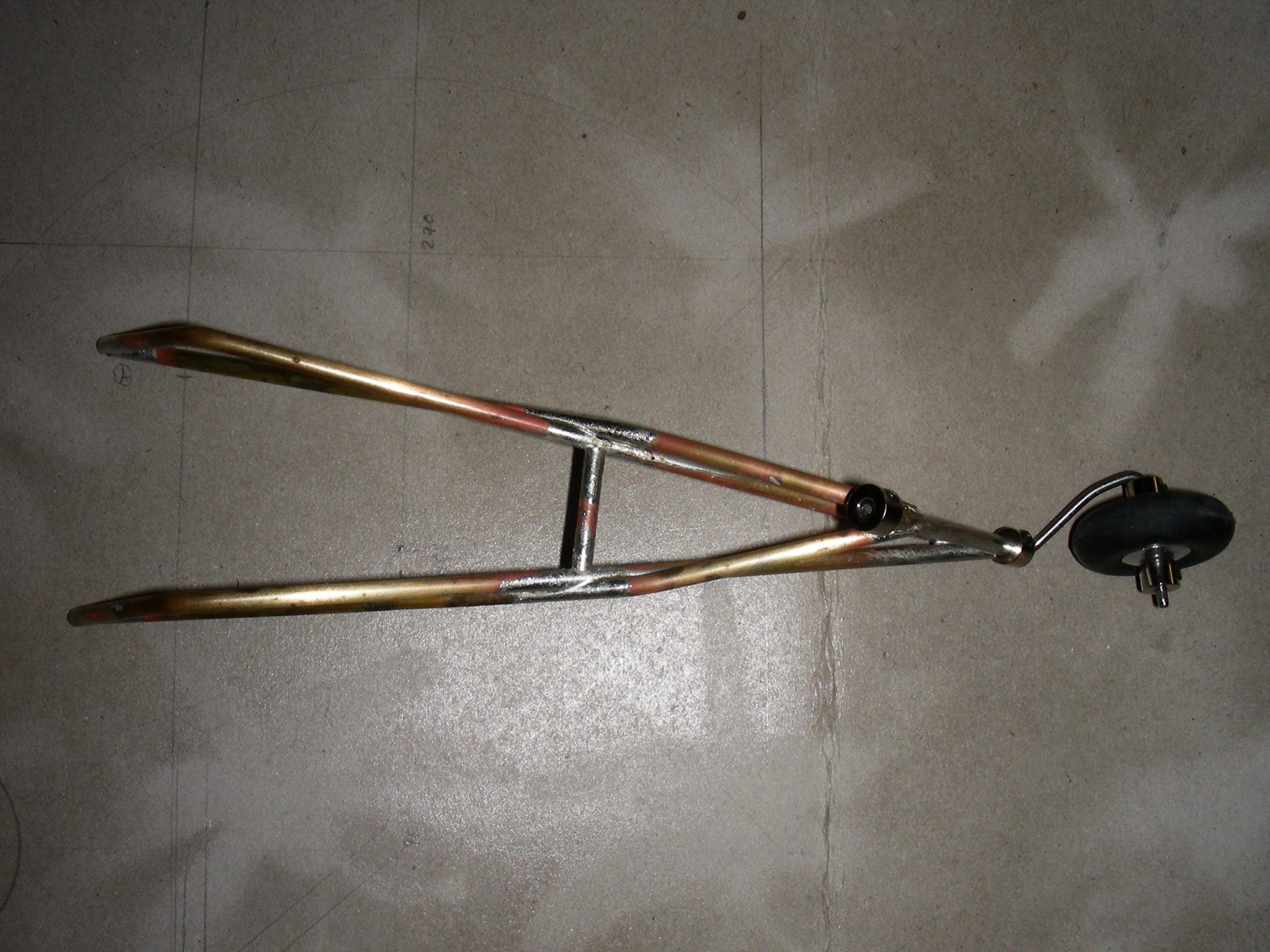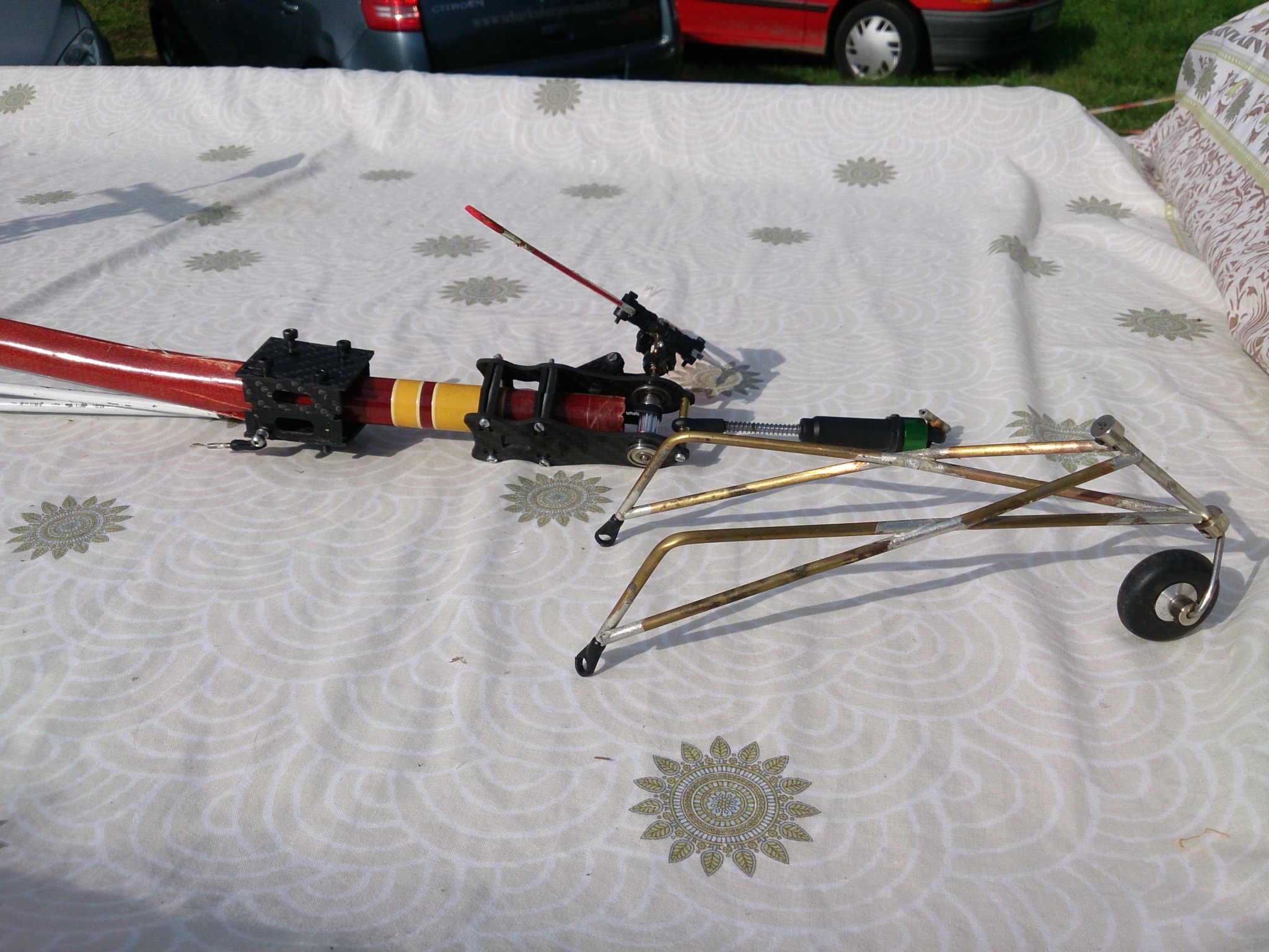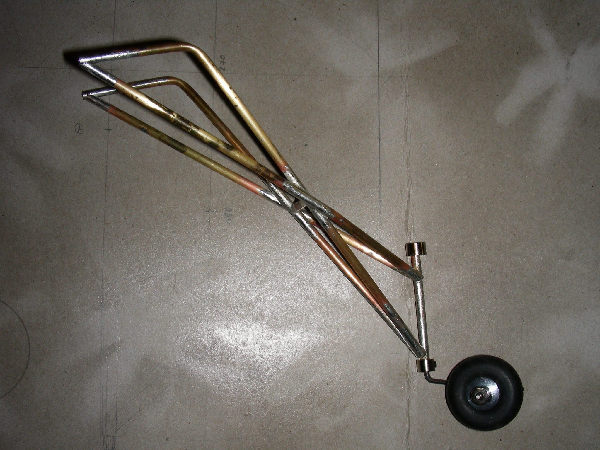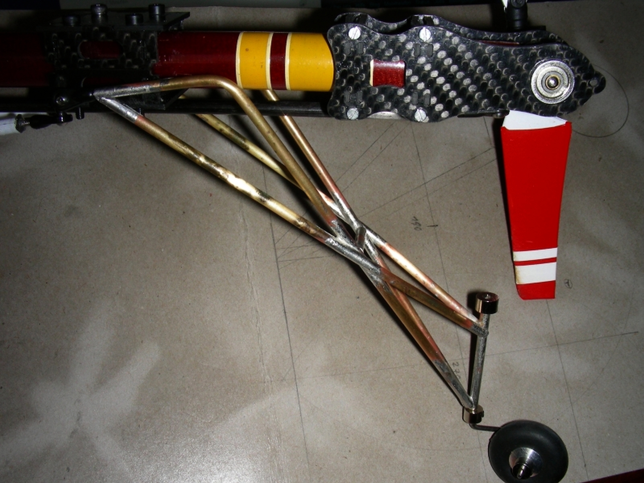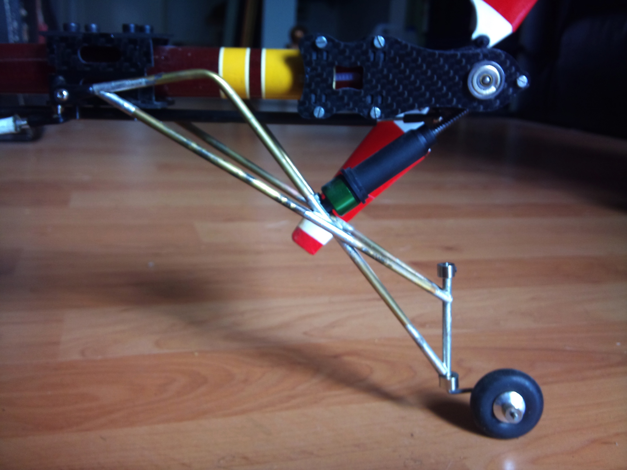 Ein wenig Messingrohr, gebogen& weich gelötet, die Reste vom Heckfahrwerk, ein Federbein aus einem RC-Car, eine Kugelschreiberfeder, Kugelpfannen& -köpfe...
