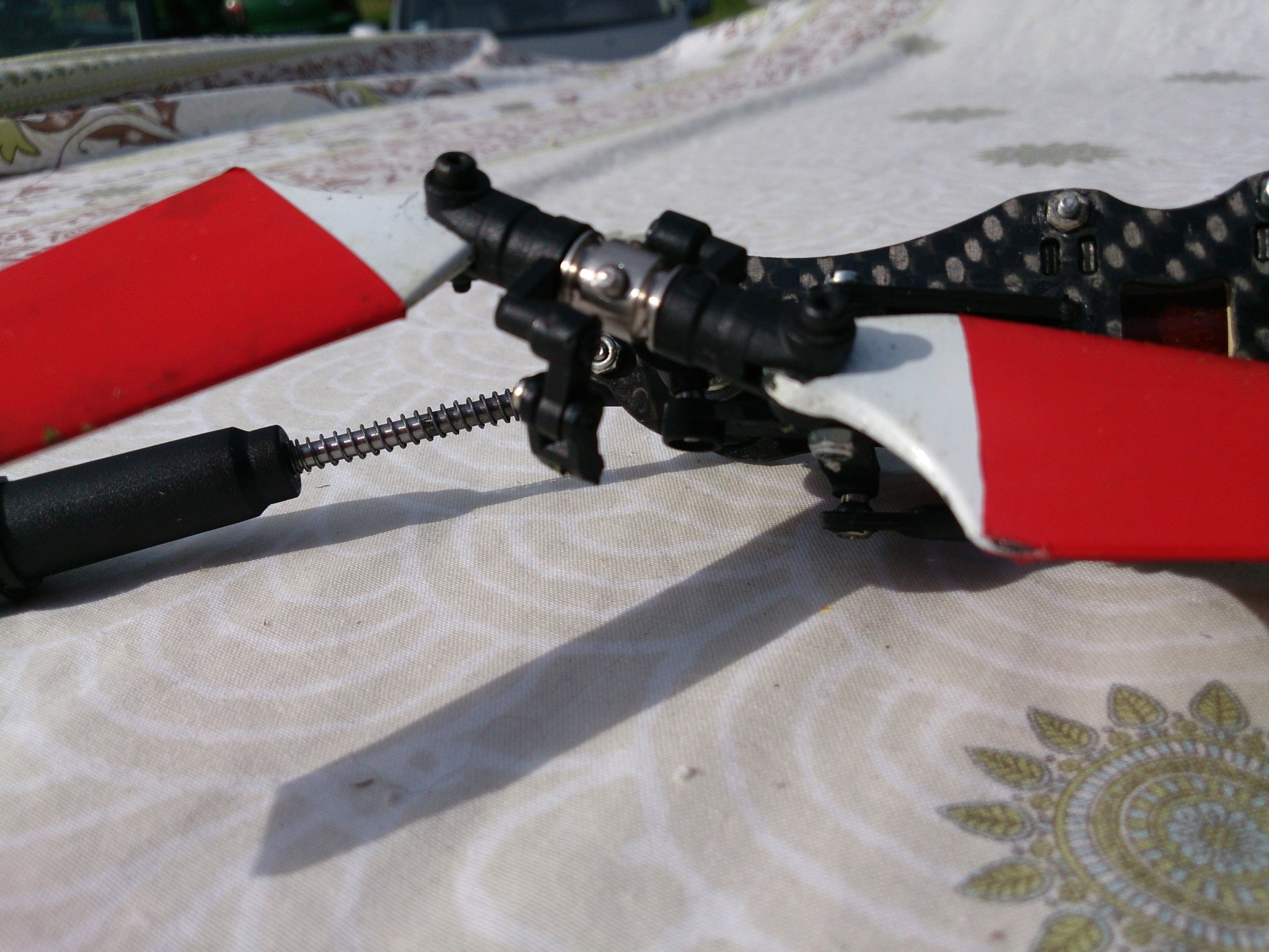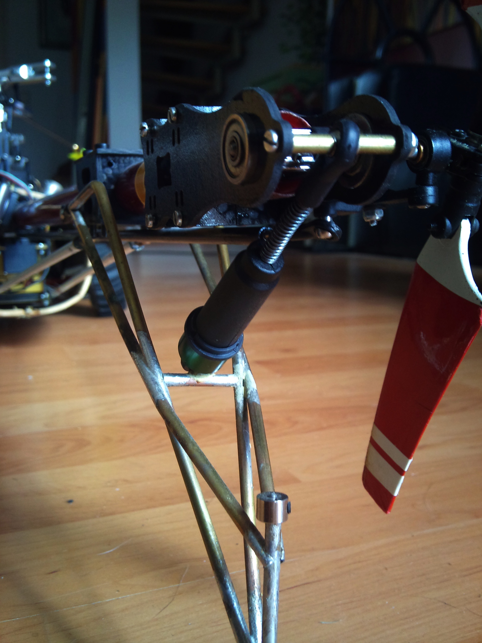 Er teilte mir auf Nachfrage mit, dass die beiden Muttern auf der Blattlagerwelle jeweils um maximal 1,5 Umdrehungen geöffnet werden dürfen, um den Kopf elastischer zu machen. Sonst bekommt man da nämlich ein gar herrliches Wobbeln in den Rotor. Ja, und es funktioniert hervorragend! Ich kann bis auf etwa 800U/min runter.