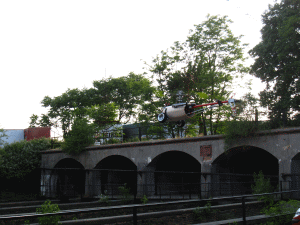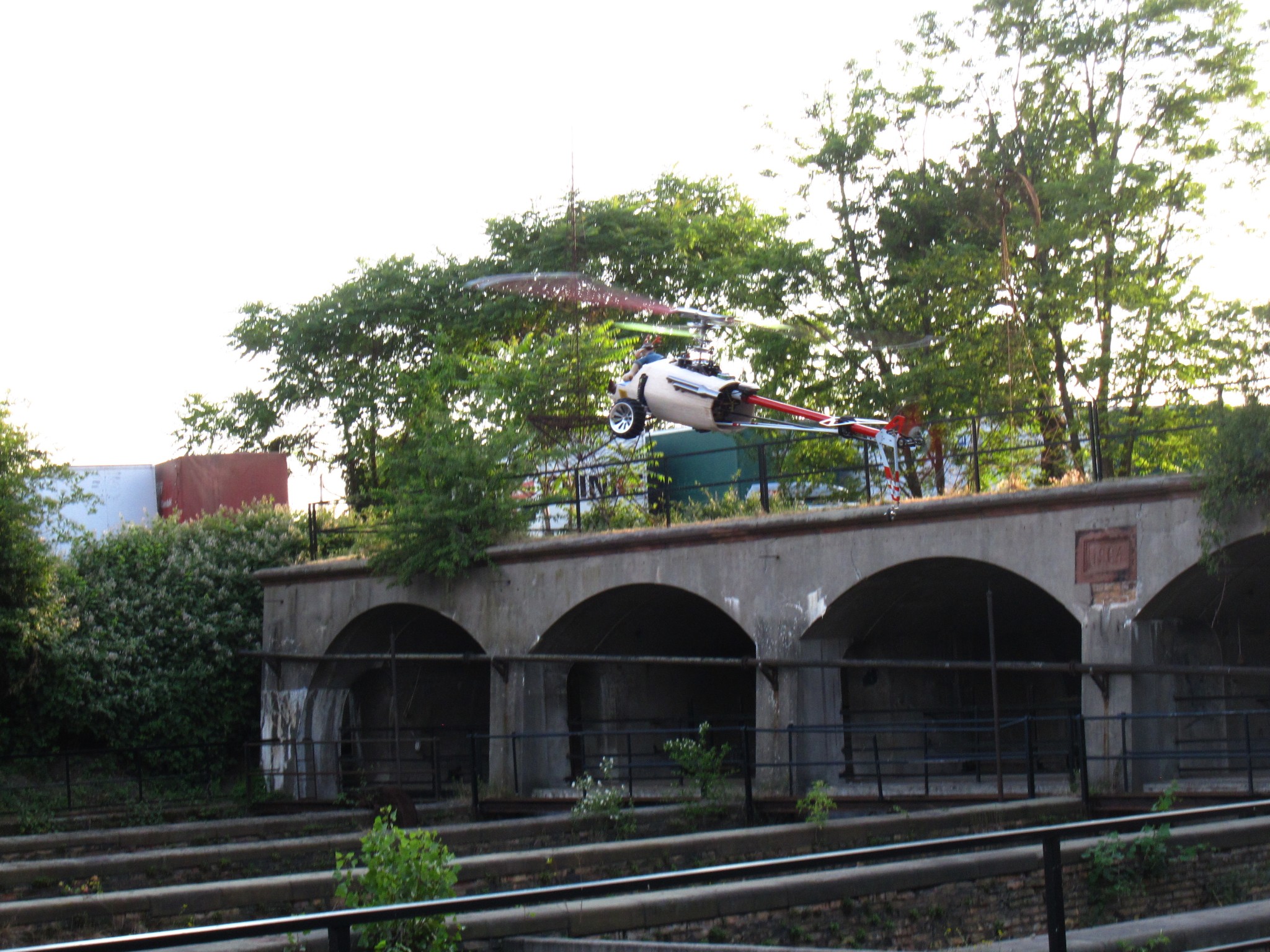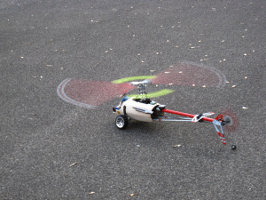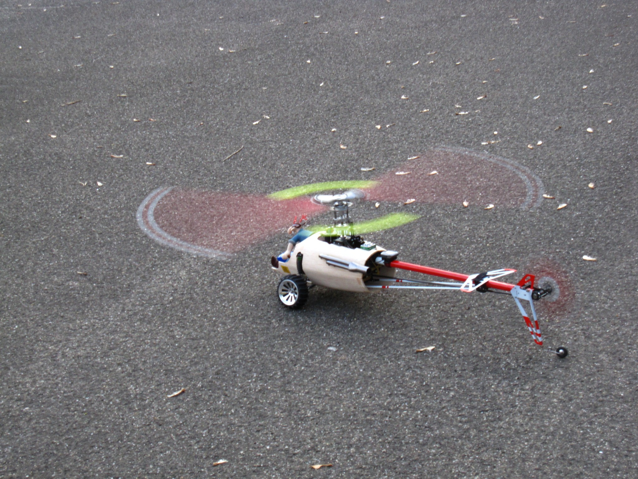 ...und dann lief der Photograph mir einmal zu oft in den Weg, ich wurde nervös& erwischte, während ich hinter dem Geländer flog, den Motor-Aus... bis der Motor wieder angelaufen wäre (wir erinnern uns, das ist ein Jazz, der da werkelt) wäre Werner schon in der Grube baden gegangen, also blieb nur der Versuch per AuRo... klappte auch ganz knapp, ich bekam den Heli noch über's Geländer und ein Stück weit Abstand, aber dann gab's einen Blade-Stop in knapp 1,5m Höhe... zwar konnte ich den Heli noch gerade absetzen, aber er kam zu schnell runter.