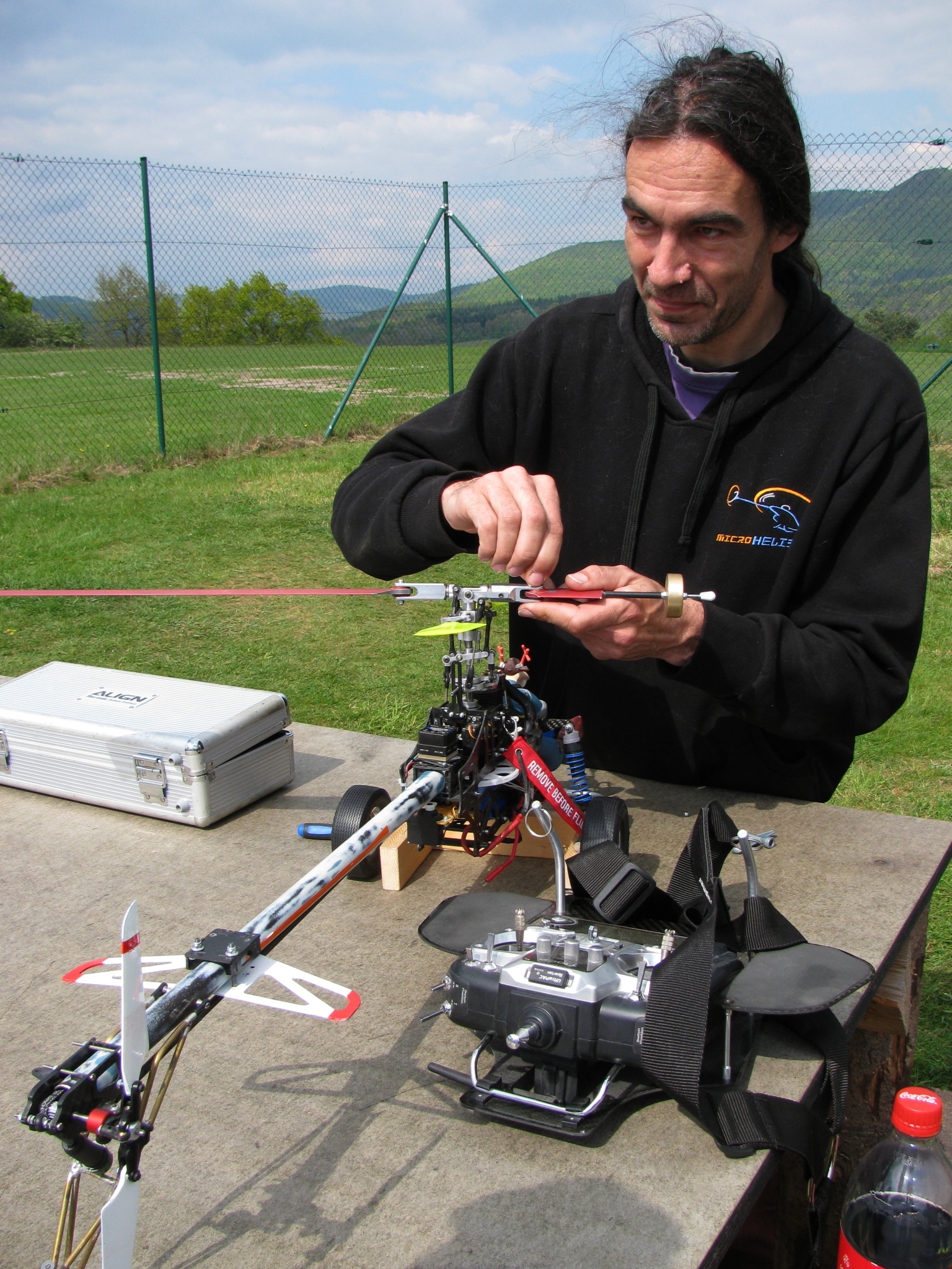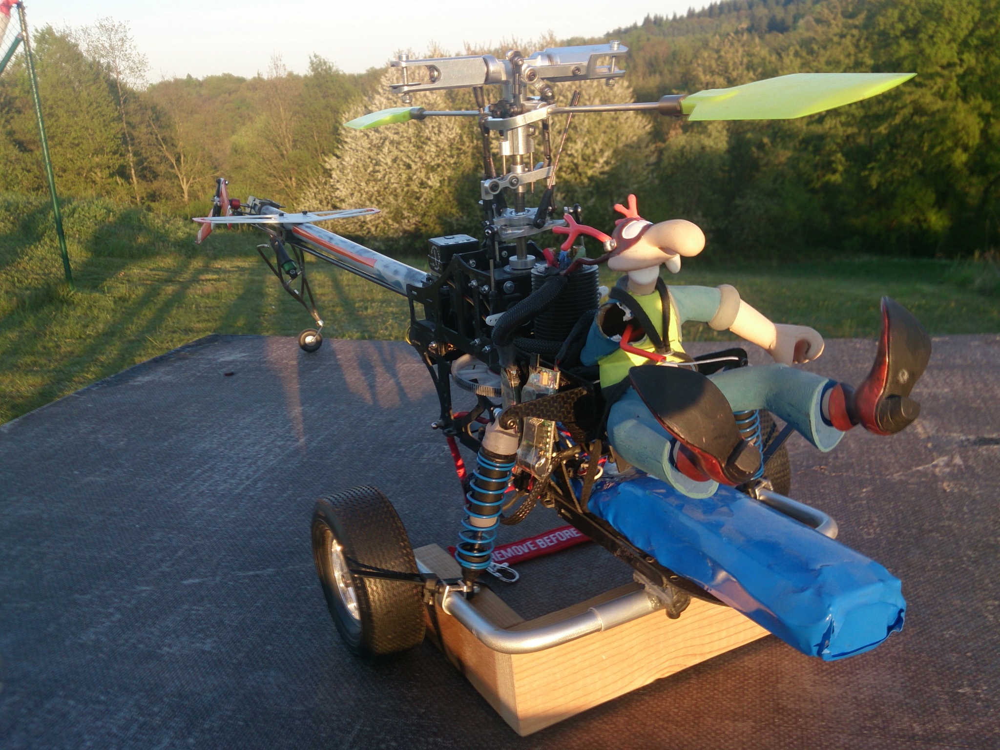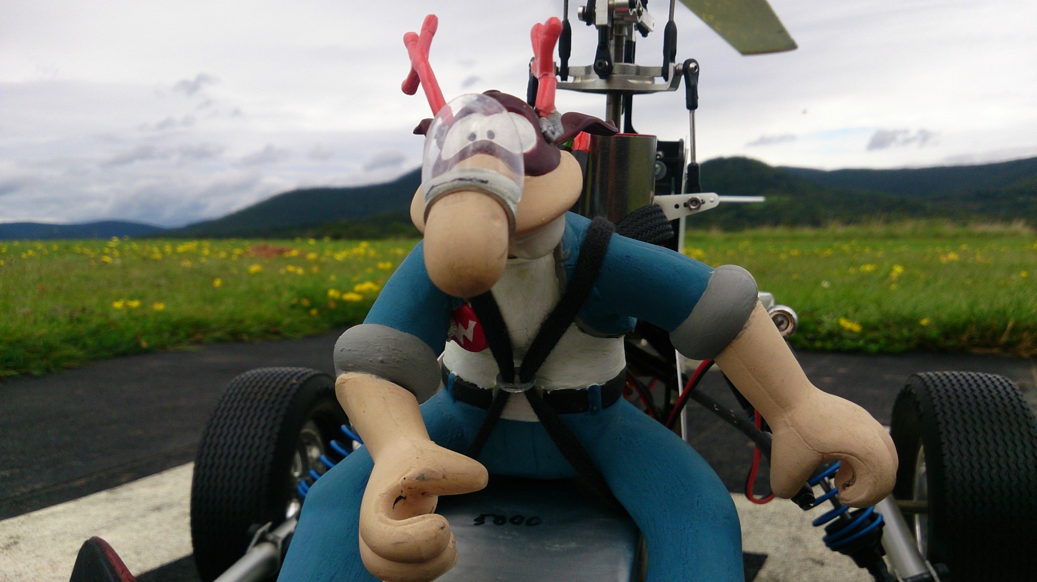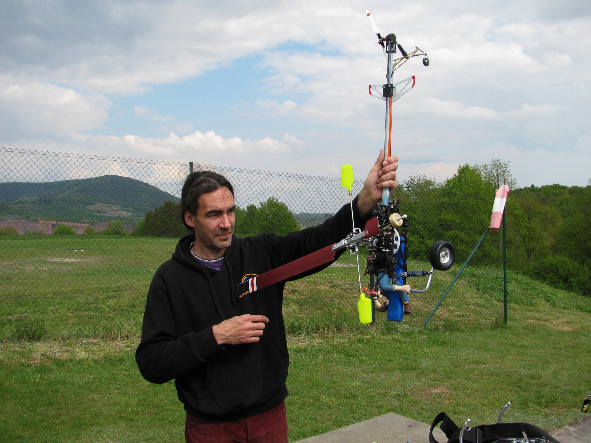 Als ich damit das erste Mal auf den Platz kam, hatte ich nur ein Rotorblatt in der Hand, und dann "plötzlich festgestellt", dass ich das zweite daheim vergessen hätte... sofort bei den Kollegen hektisches Gewusel am Platz, ob einer für Werner passende Blätter hätte. Hat natürlich niemand, der ECO8 hat schmalere Blattwurzeln, als der T-Rex...
