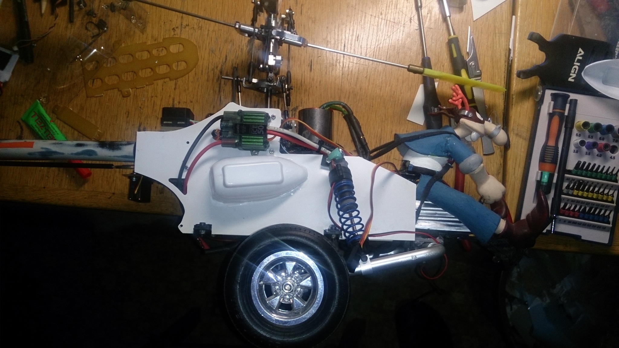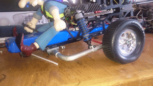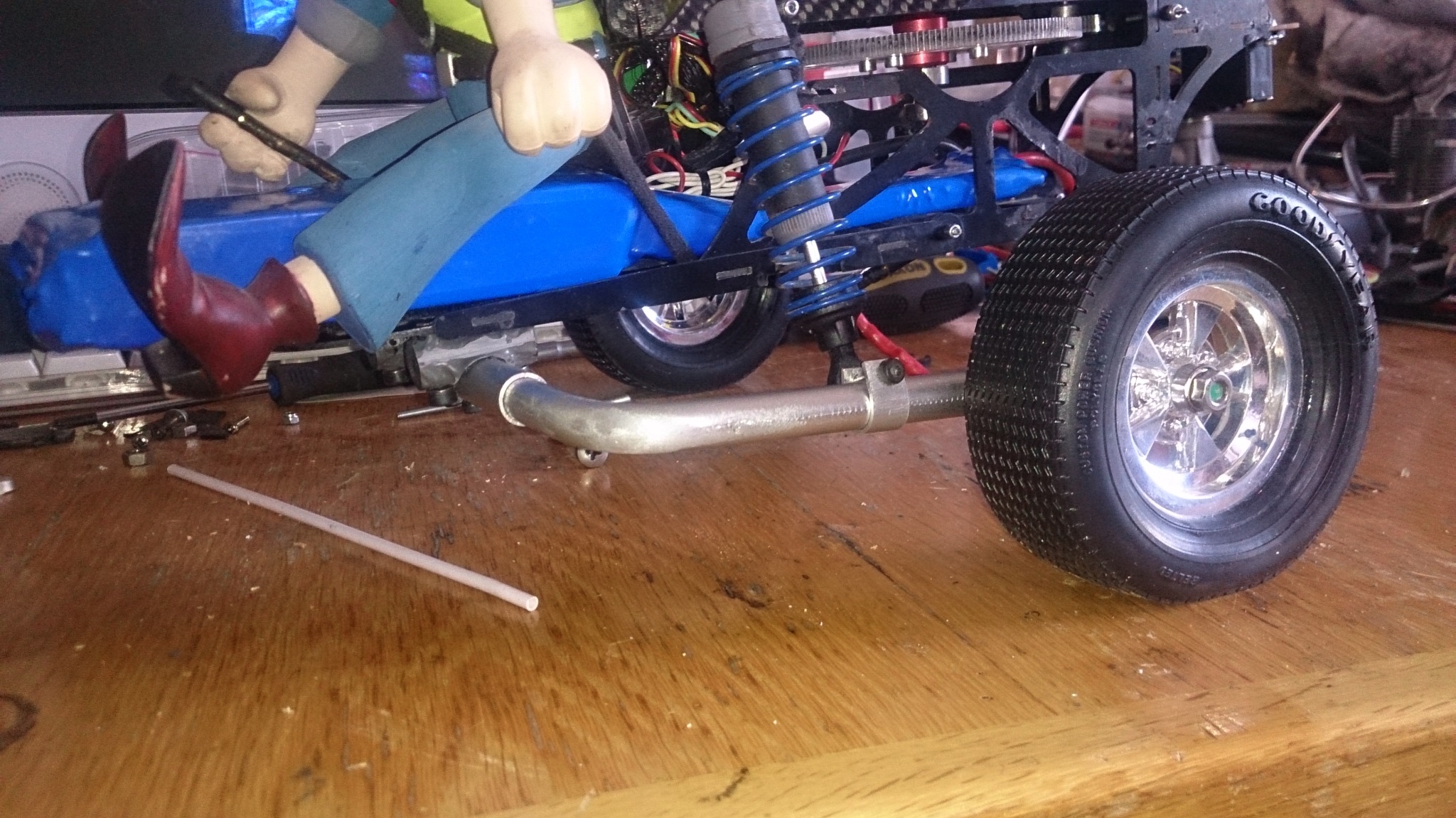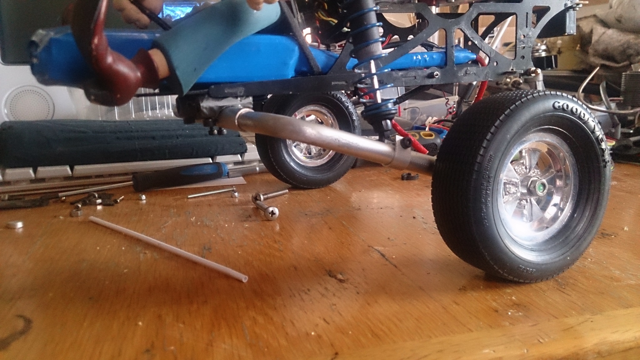 Die Räder sind aus einem Bausatz von Monogram für einen Ford Hot Rod, die Federbeine hat ein MTA4 S28 gespendet.